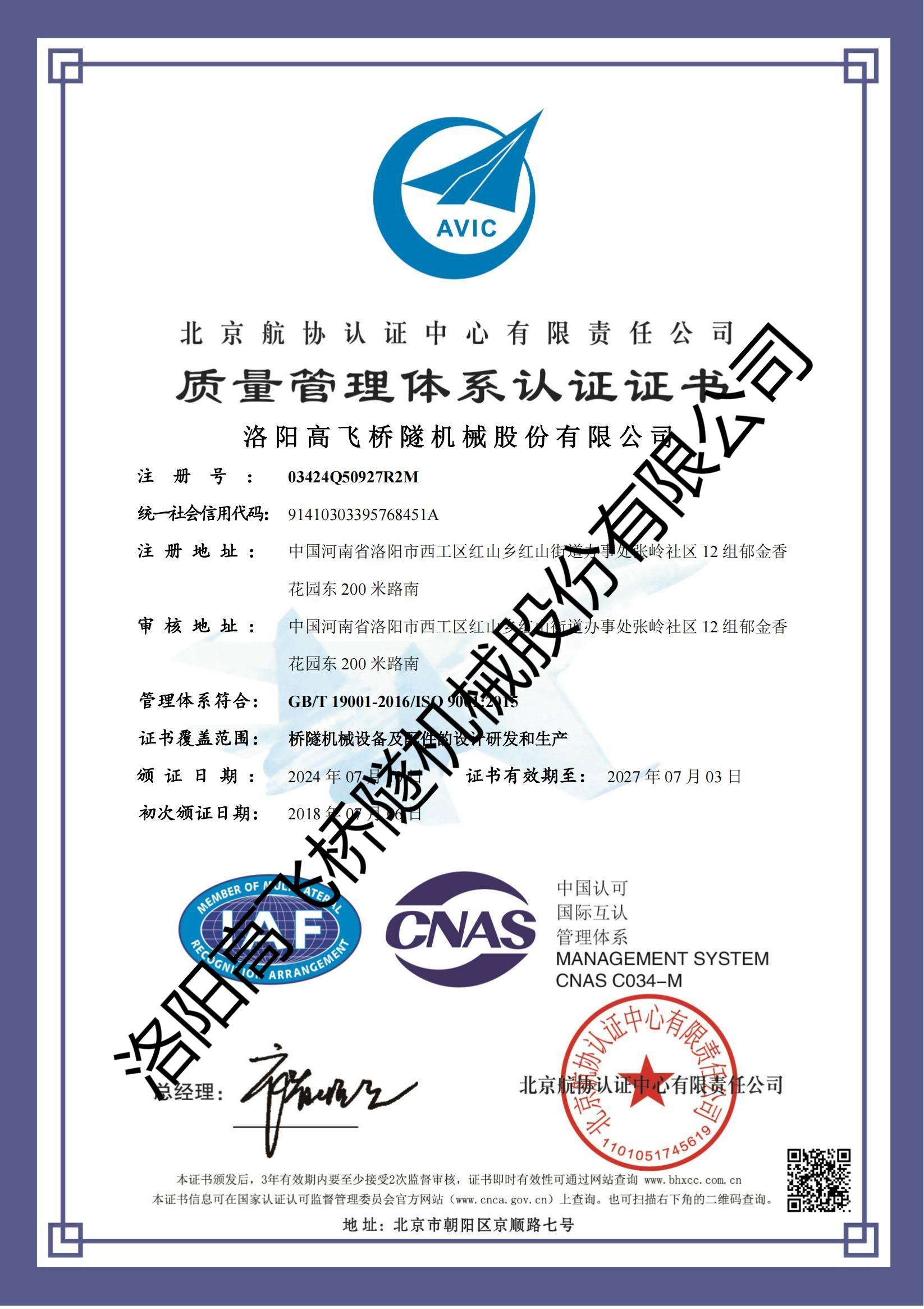 北京航協(xié)質(zhì)量管理體系認(rèn)證證書(shū)