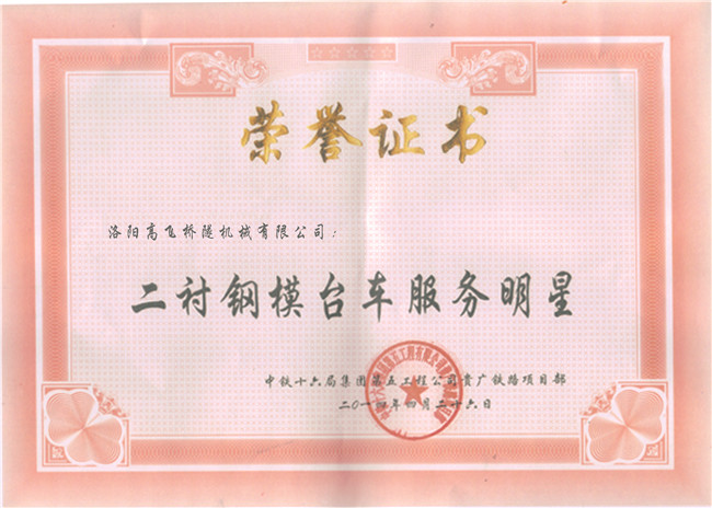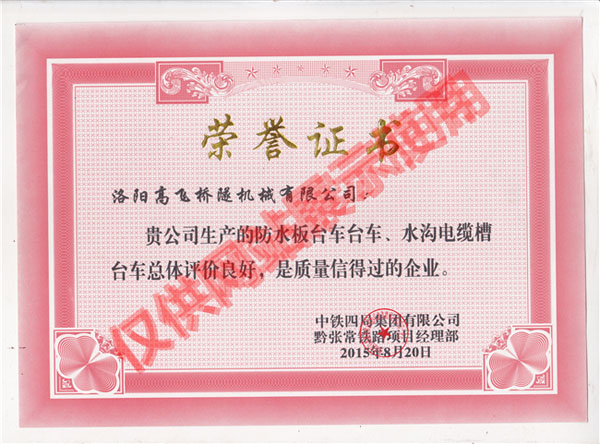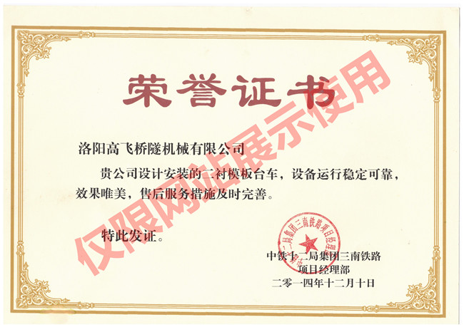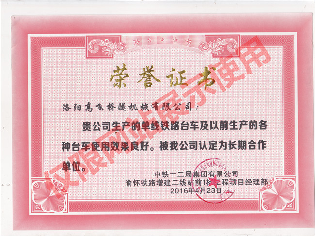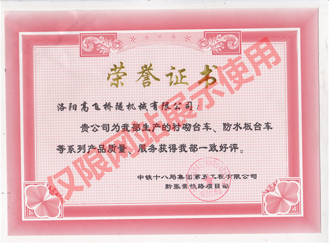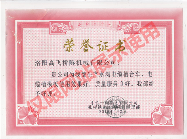 田恒鐵路項(xiàng)目榮譽(yù)證書