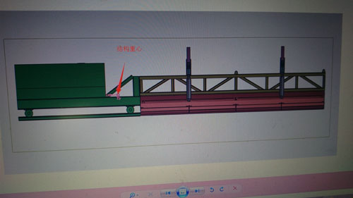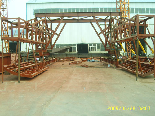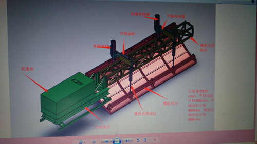 結(jié)構(gòu)∶液壓驅(qū)動(dòng)自行式移動(dòng)棧橋,主要由前橋、主橋、后橋、前段支架、后段支架、行走驅(qū)動(dòng)裝置、行走支架七個(gè)部分組成。